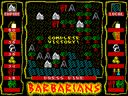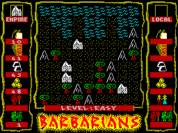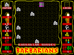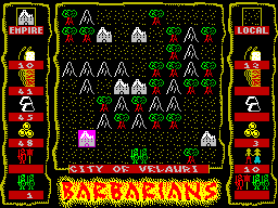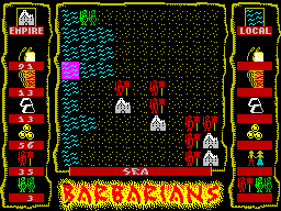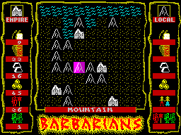 Barbarians is a game of strategy for one player, running on the Sinclair ZX Spectrum. You take the lead of a civilised league of twelve cities at the very time the barbarians are entering the land. Your task is to raise armies and send them against the advancing hordes, and you will not rest until every last one is wiped out. While this is going on, you have to manage your empire's economy.