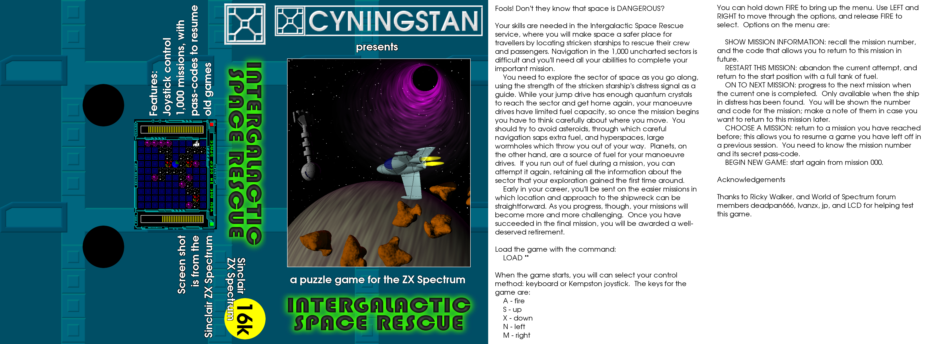 | RescueInlay.png | The cassette inlay for those who want to put Intergalactic Space Rescue on a tape for playing on a real Spectrum. This should be printed 4 inches (102mm) high. Either cut out the cassette holes, or trim that whole section away if the back of your case is not transparent. |